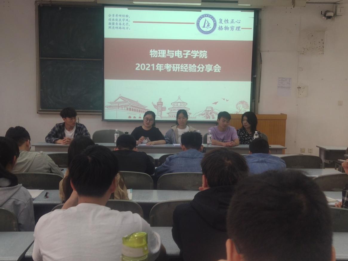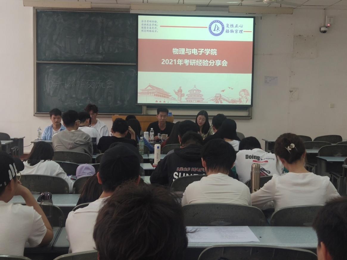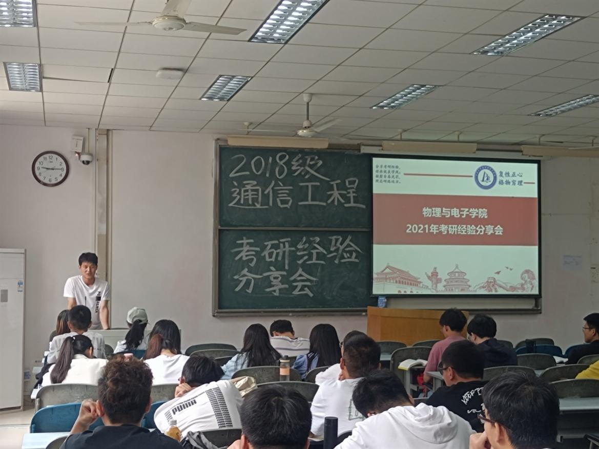 魏凌结合当前大学生考研和就业形势,分析考研优势,鼓励学生根据自身实际,明确考研目标、方向,理清考研和就业的关系。随后,考取研究生的20名学生代表分别从自身考研经历出发,围绕专业和院校选择、复习计划制定、时间管理和心态调整等方面谈了亲身体验和感受。考取华中科技大学的物理学专业的范丫琦,详细介绍了自己报名参加夏令营、考研各科目复习、初试及复试面试准备的全过程,并分享了自复习计划与技巧。考取厦门大学的测控技术与仪器专业李成卓,从考5次英语四级谈起,提出考研要提高学习效率、合理规划时间、学会控制情绪,并坚定考研信心。保送至北京大学的电子信息科学与技术专业张以凝,从推免研究生信息获取、学校和导师情况了解、个人简历准备及投递等方面分享了自己的成功经验。保送至西安电子科技大学的通信工程专业的高廷帅分享了在没有科研竞赛成果的情况下,怎样获得心仪学校的offer。2018级学生也积极向学长学姐请教自己关心的问题,分享会现场气氛热烈。