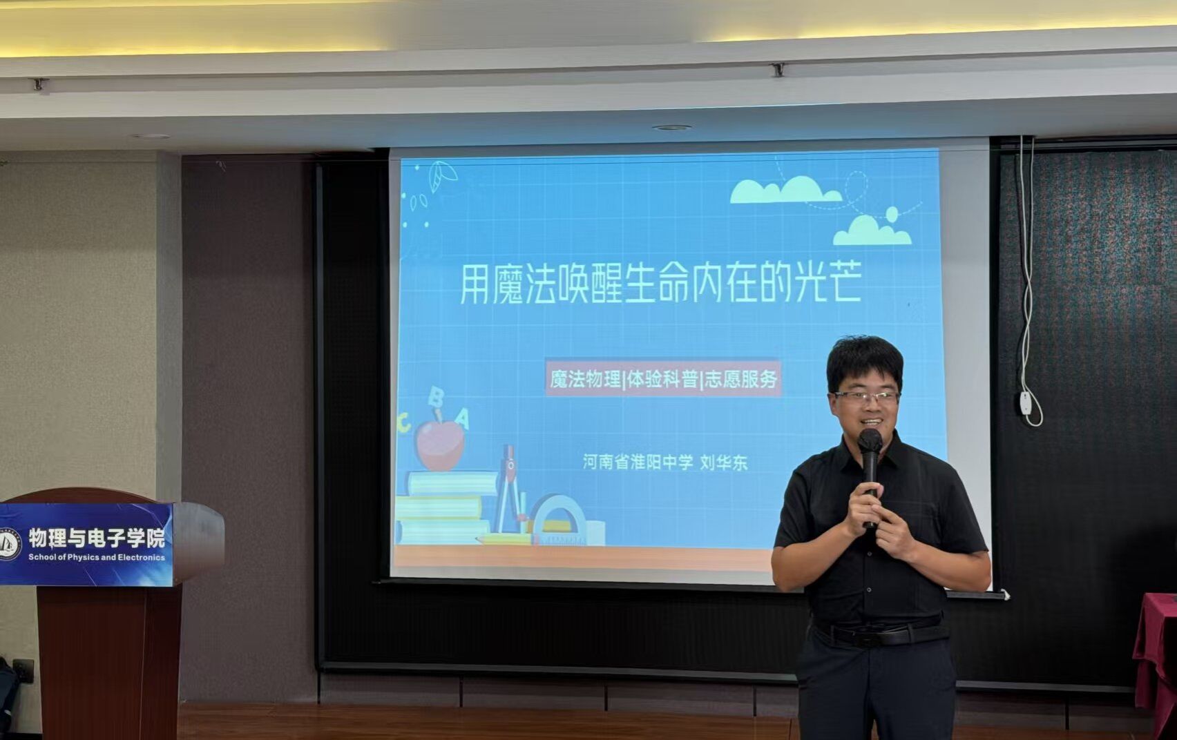 刘华东以“用魔法唤醒生命内在的光芒”为题,结合15年农村教学经历,分享“火焰掌”“水火箭”等标志性案例。“火焰掌”实验曾让厌学学生主动探究原理,“水火箭”等低成本实验让垫底班级物理平均分半年提升20分,这些创新已形成“趣味实验+生活场景+学科知识”体系。他表示“教育的‘魔法’是蹲下来看学生世界,用他们能懂的方式传知识温度”,引发在场教师共鸣。