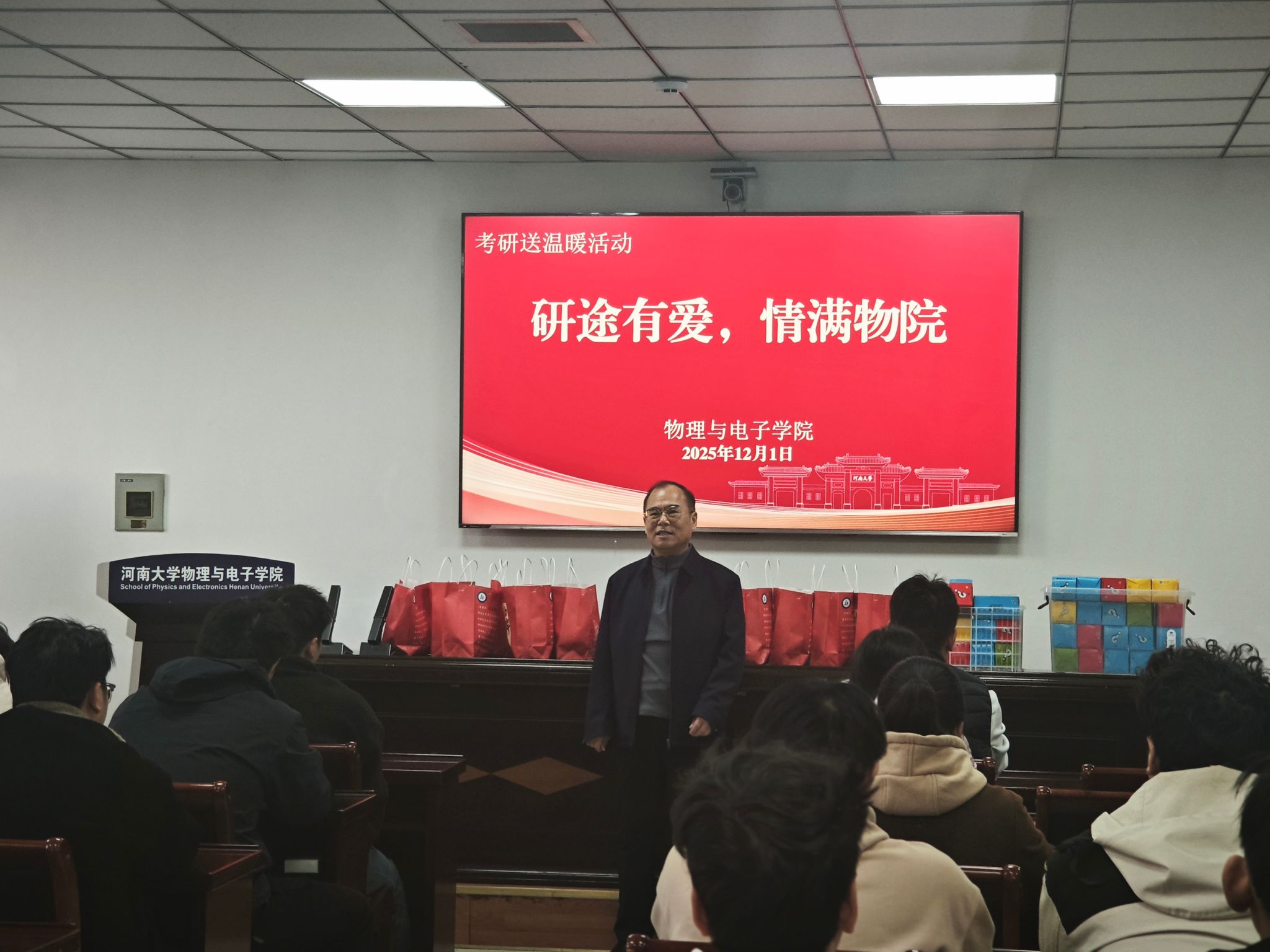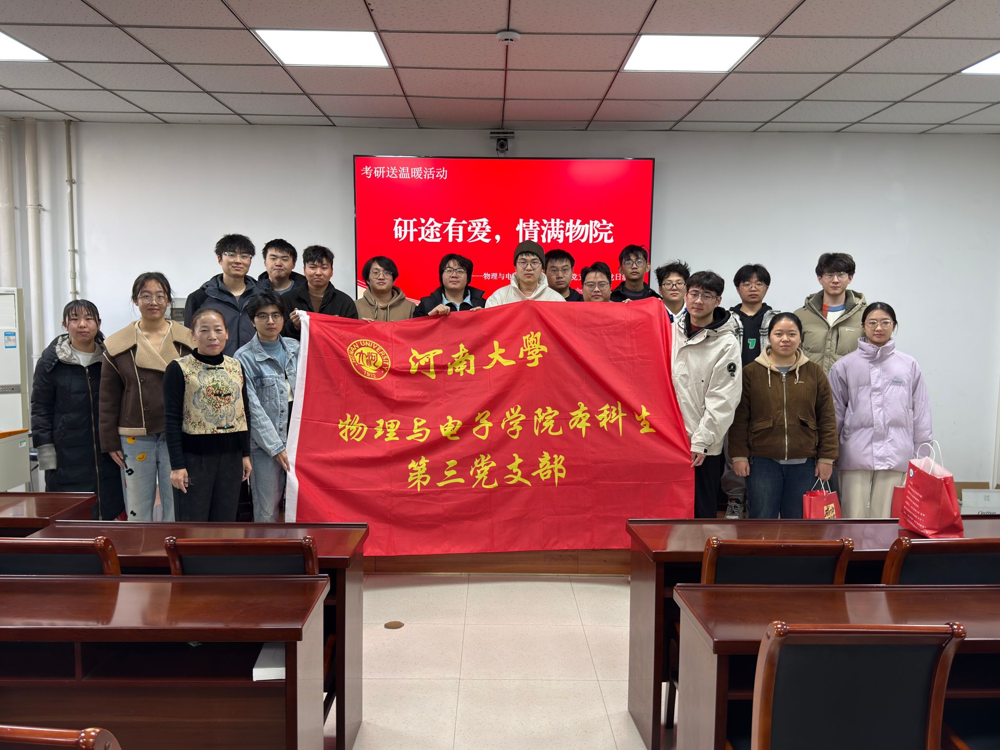 句句叮嘱传关爱,份份礼包聚力量。此次活动是支部落实立德树人根本任务、践行“党建+服务”关爱学生成长成才的具体实践,不仅为备考学子带来了物质支持,更给予了精神慰藉与奋进动力。相信物院考研学子们必将承载着这份温暖与期盼,自信奔赴考场,笔锋所至,梦想花开。