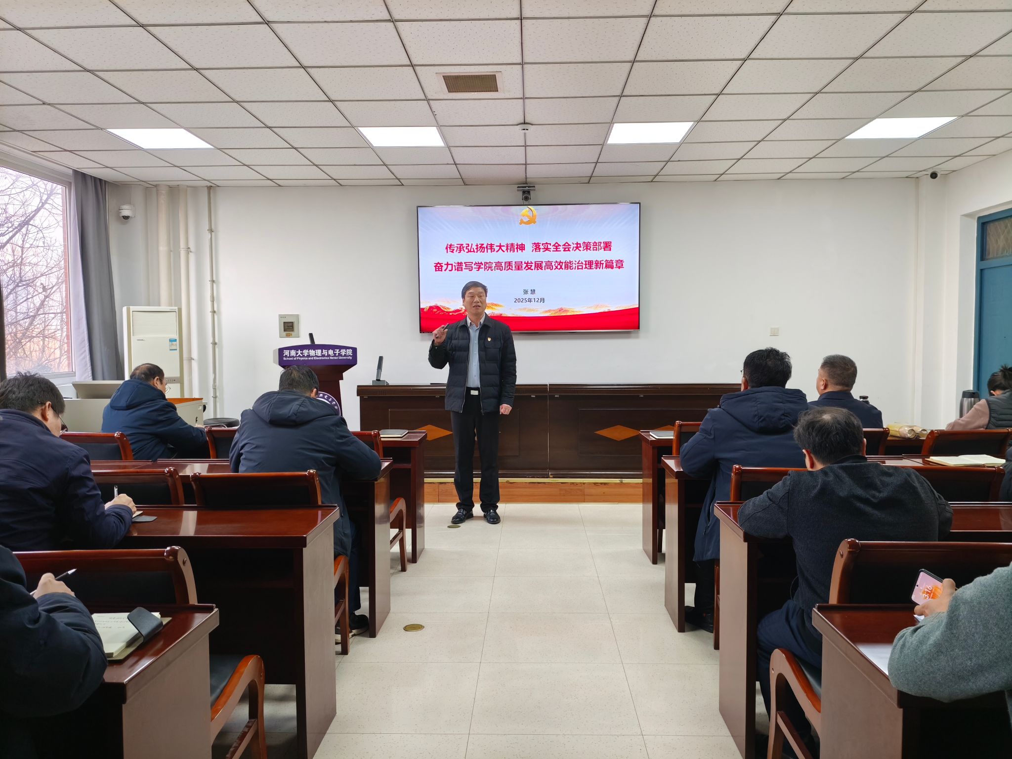 张慧以《传承弘扬伟大精神,落实全会决策部署,奋力谱写学院高质量发展高效能治理新篇章》为题,从“深入学习贯彻党的二十届四中全会精神”“在团结奋斗中谱写两大奇迹新篇章”“传承和弘扬中国共产党人精神谱系”“严明纪律规矩守底线勇担当强作为”“奋力谱写学院高质量发展新篇章”等5个方面为全体与会人员讲授了一堂生动的专题党课。