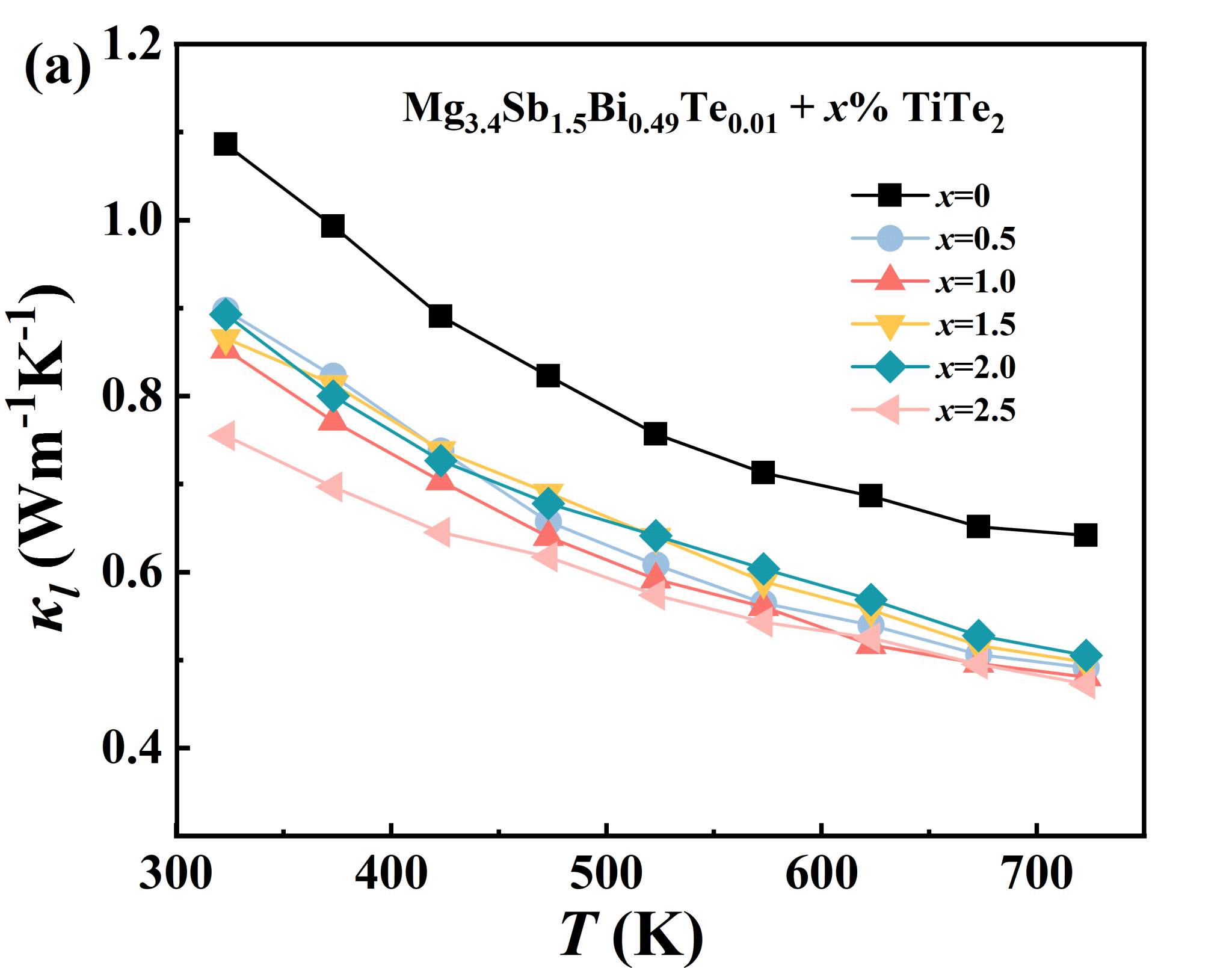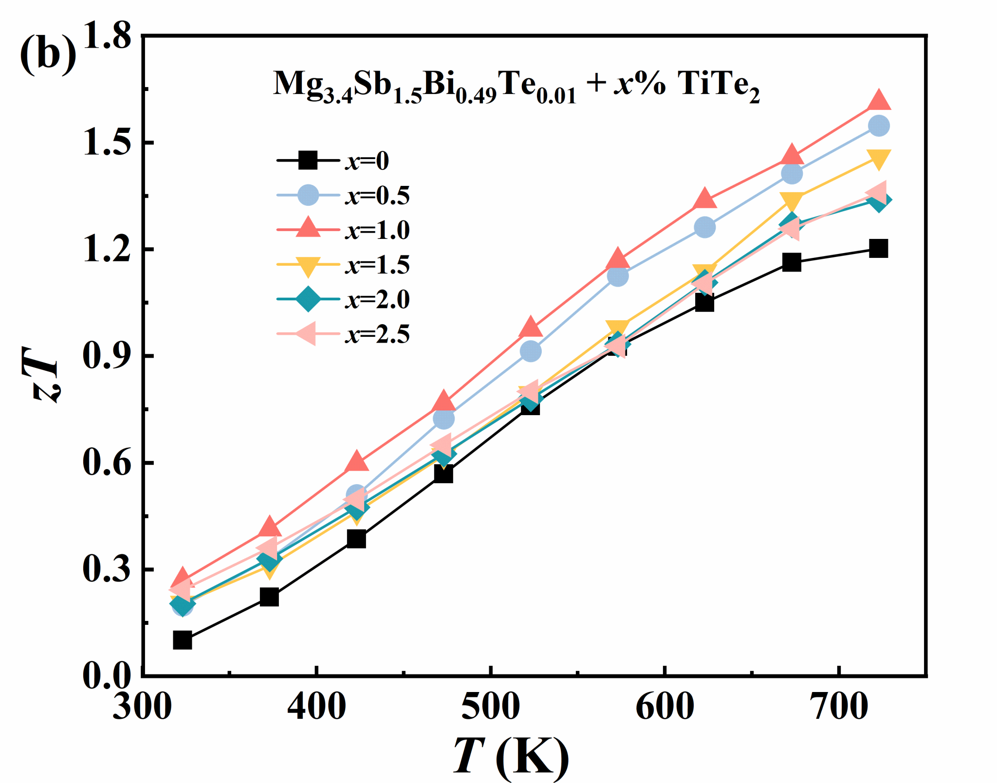本科生科研团队勇于探索,提出 TiTe2原位双位点掺杂新策略,并深入探究了TiTe2在n型 Mg3.4Sb1.5Bi0.49Te0.01体系中的调控机制。研究表明,TiTe2在烧结过程中原位解离并实现双位掺杂,有效提高载流子浓度、优化功率因子,同时诱导产生纳米析出沉淀和位错,构建多级声子散射中心,大幅降低晶格热导率。实验结果显示,1% TiTe2掺杂样品在 723 K 时zT值可达1.61,较未掺杂样品提升34.2%,实现电、热输运性能协同增强。