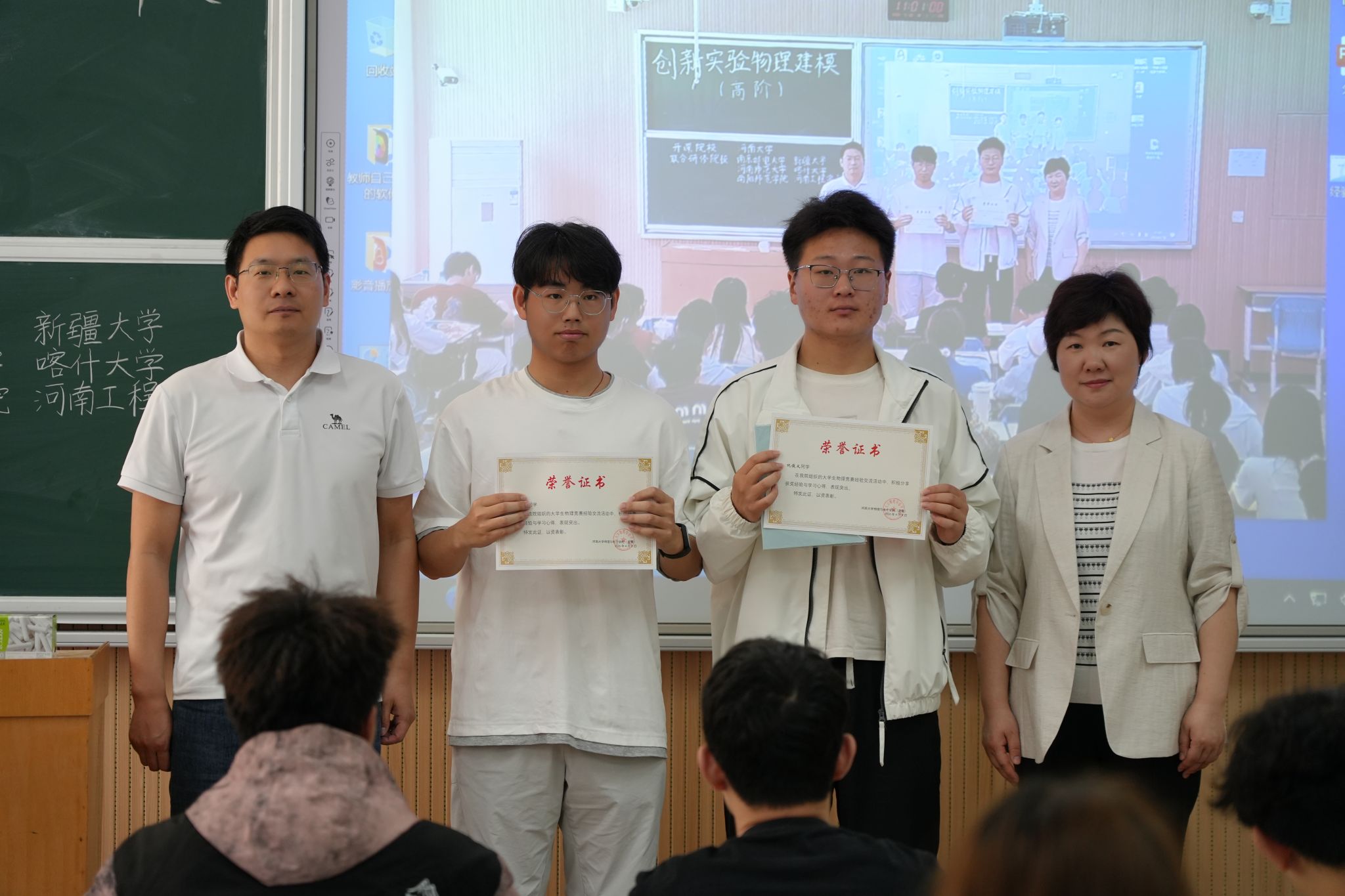 的仇俊义同学结合自身经历,与大家分享了全国大学生物理实验竞赛(创新)命题类一等奖的参赛心得;叶锋同学则从选题论证、实验设计及数据处理经验等方面,为大家介绍了命题类竞赛的相关内容。两位同学的精彩分享为同学们提供了可借鉴的备赛路径。分享结束后,学院为两位同学颁发了荣誉奖状与奖品,以激励在场学子奋勇争先。