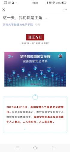 在学院网站、电子显示屏、微信公众号上推送“国家安全教育”相关知识;在教师微信群宣传河南省教育厅微信公众号上推出的典型案件;在学生QQ群上传《坚持总体国家安全观 提高国家安全意识》PPT,PPT从危害国家安全的案例开始,分析了新形势下国家安全面临的压力和风险,要求学生提高认识,树立国家安全的主人翁意识。